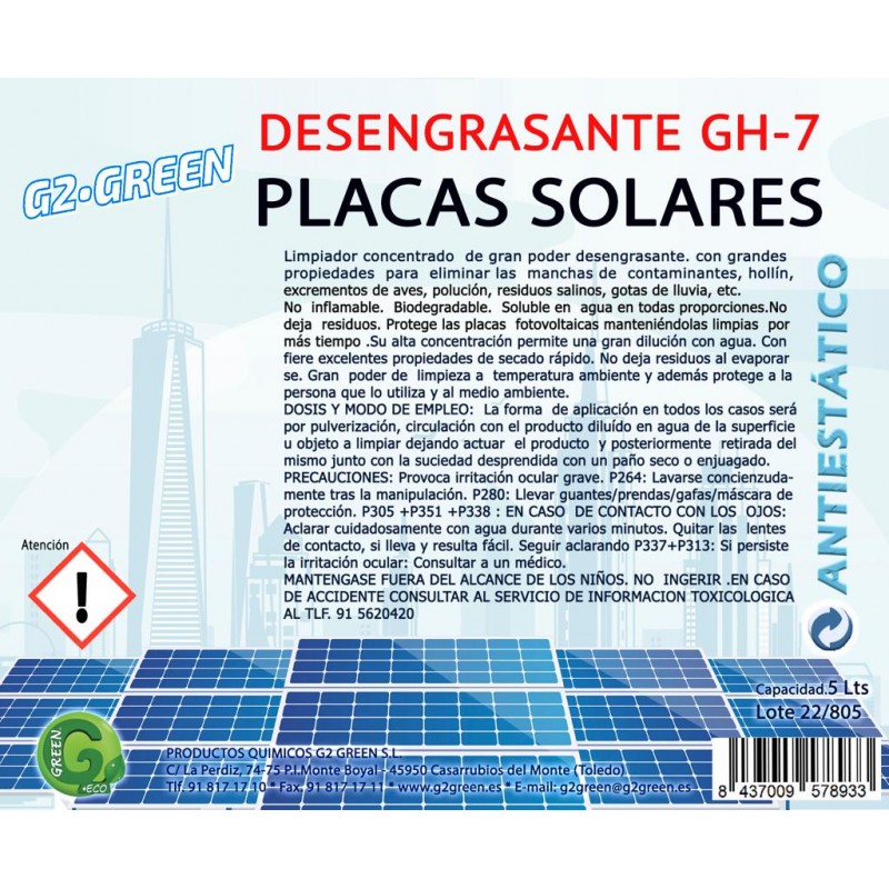 Desengrasante Limpiador Placas Solares 5L, limpiador concentrado de gran poder desengrasante elimina manchas de contaminantes, hollín, gotas de lluvia, polución; biodegradable formulado en base a compuestos respetuosos con el medio ambiente, no inflamable, no deja residuos, secado rápido.