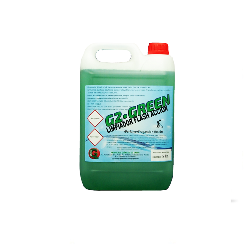 Limpiador Multiusos Flash Acción 5 L es un limpiador concentrado de gran poder desengrasante, alto contenido en bioalcoholes le confiere excelentes propiedades disolventes de la suciedad permitiendo además un autosecado rápido de las superficies. Es ideal para la limpieza de cerámica, gres, mármol, sanitarios, duchas, azulejos, encimeras, cristales, frigoríficos, paredes lavables, mesas. Su alta concentración en perfume dejará un agradable aroma en el ambiente.
