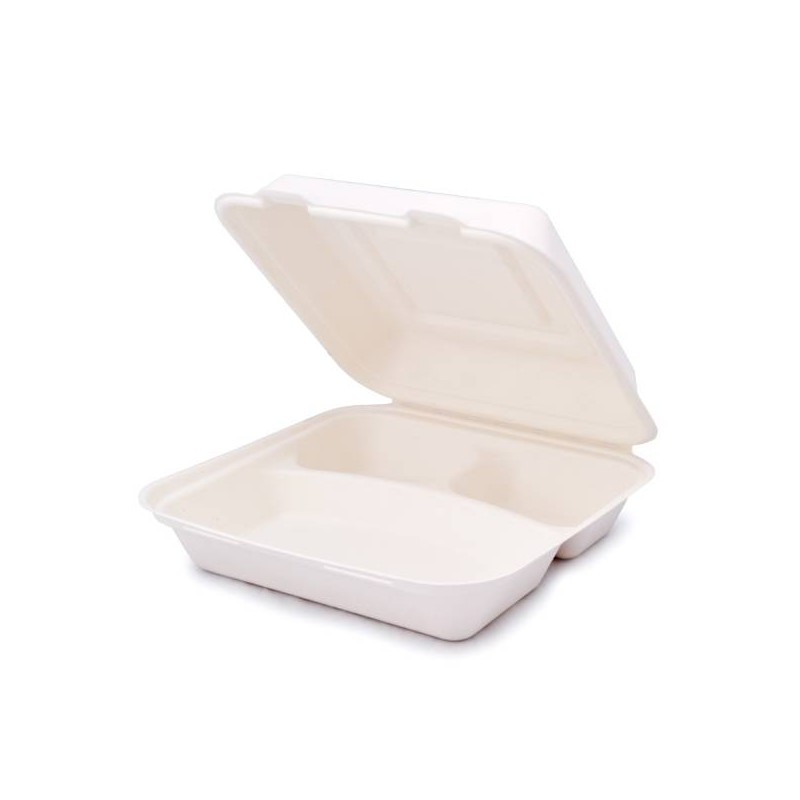 Envase comida fibra 3 compartimentos, 200 unid, 100% biodegradable y sostenible; mantiene la temperatura de los alimentos gracias a su cierre y rigidez del material;. Uso en restaurantes, bares, pizzerias, hamburgueserias, catering.