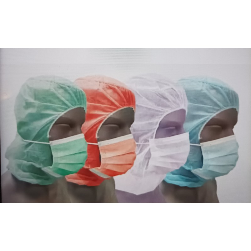 Gorro integral con mascarilla 3 capas polipropileno desechable, color azul, 500 unidades 5x100 unid, talla única; gorro integral que proteje las fosas nasales y la boca con la mascarilla 3 capas.